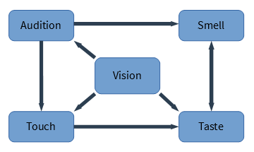 This diagram, unlike the linear scale, suggests that vision to touch or taste is directly possible, as in hearing to smelling. Other data seems to support this diagram over the linear scale as a more accurate model (see below).