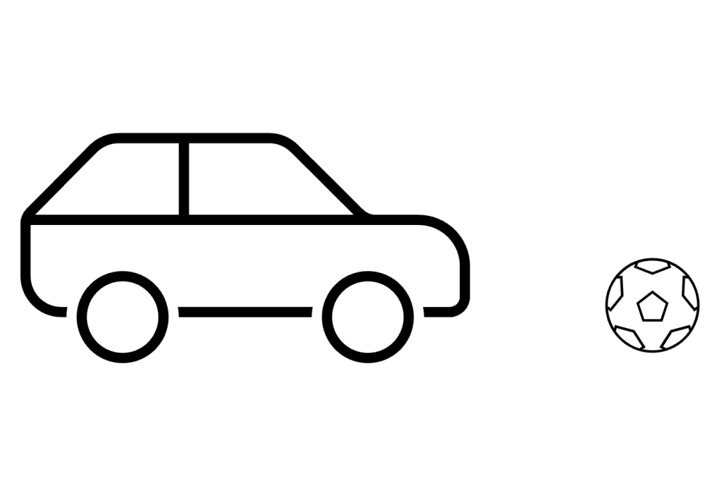The next most complicated in the intrinsic frame of reference. In the intrinsic system, the vectors are projections from inherent features of the ground. For example, in the following picture the ball is “in front of” the car: the car has an inherent front (the side facing its typical direction of travel) according to the rules of the English language and culture. If something is “in front of” the car in the intrinsic sense, then you can find it by following a line projected outwards from the front of the car.