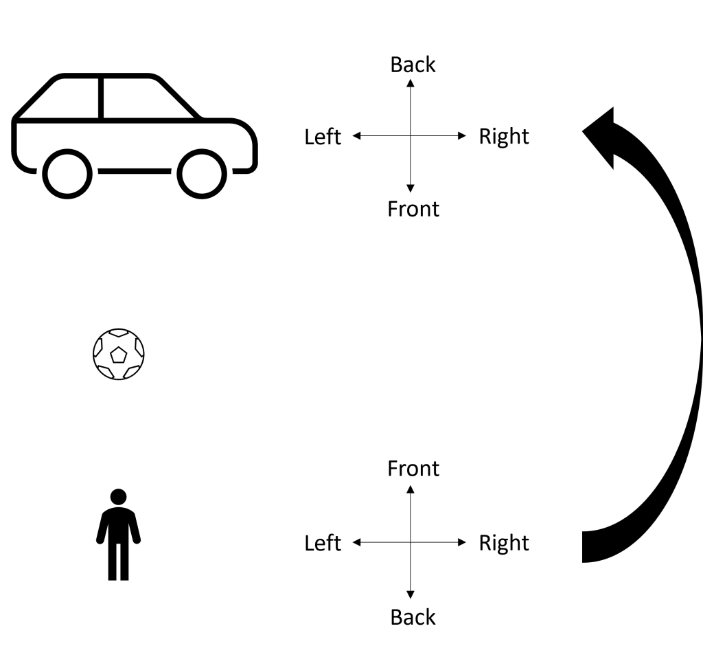 The relative frame solves some of these problems by projecting a coordinate system based on the speaker’s orientation onto other ground objects. Speakers are human and thus have available forwards, backwards, left and right directions. These viewpoint-dependent directions can be extended to other ground objects by translation, rotation or reflection. In English the speaker’s coordinate system is reflected, so left and right are preserved but front and back are swapped: